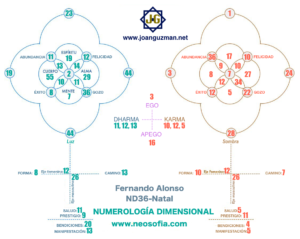 Volviendo a Fernando Alonso, en su máximo potencial liberado o camino 12 que todos tenemos en la vida y nos aporta fama, riqueza y felicidad, tiene en la luz el 19 EL INSPIRADOR y 3 EL CREATIVO en la sombra.